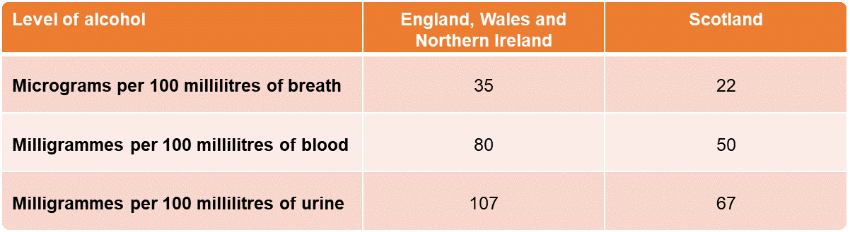 Drivers must not consume alcohol whilst driving, or prior to driving which would cause them to drive whilst under the influence of alcohol under any circumstances. Drivers should also remember that it is still possible to be ‘over the limit’ the following morning, from alcohol consumed the night before. As a reminder, the current legal limits in the UK are: